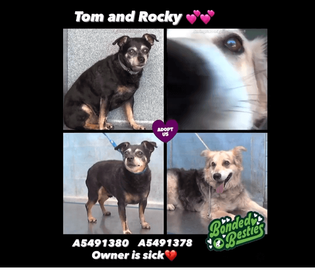 At the Carson Shelter in California, Rocky and his bonded little pal Tom were brought there when their owner was hospitalized. Sadly, the dogs have been caged and kept apart for over a month. They are so confused and so scared.