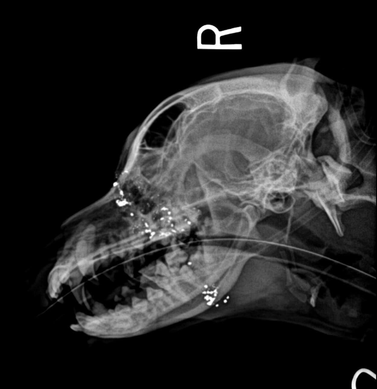 Dr. Alicia Royer cleaned away the dirt, and through the infection that had developed she spotted what looked very much like a gunshot wound. X-rays confirmed her suspicions. The dog had been shot at an angle that was slightly too steep and missed his brain. The bullet resulted in a large hole in the dog’s head causing damage to his airway and mouth. Couple his injuries with fleas, anemia and ear infections, Arthur would have to struggle to overcome his physical challenges to survive.