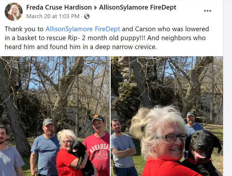 A curious puppy was saved after he fell into “a very small crack” and down into a ravine in Mountain View, Arkansas, on Sunday. The Allison-Sylamore Fire Department shared photos of the rescue effort, explaining that their repelling team was utilized to access the pup.