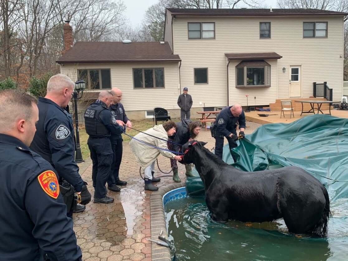 On Saturday, rescue personnel at the Suffolk County Police Department responded to a 911 call after a black horse got herself trapped in a backyard inground pool in Bohemia.