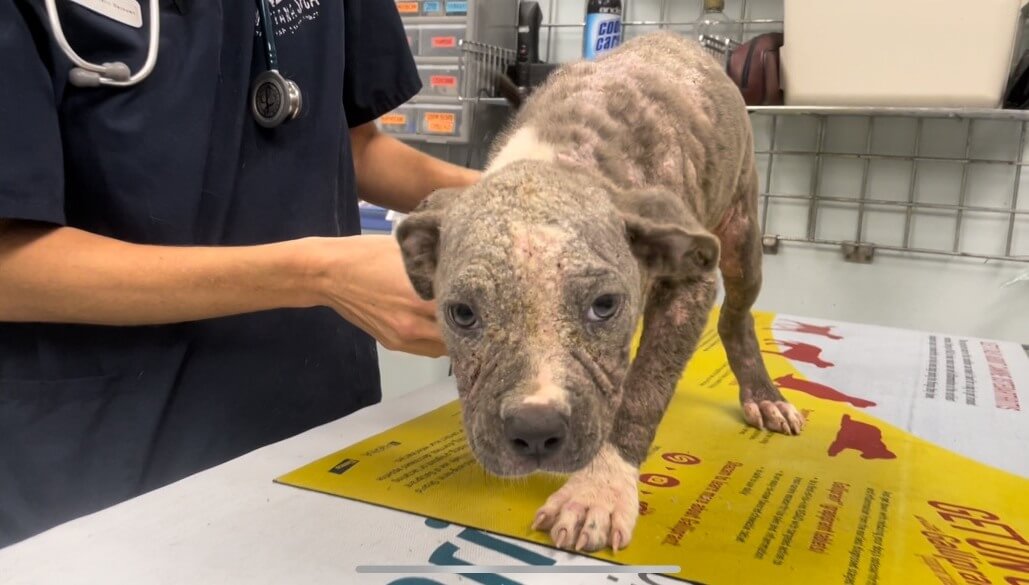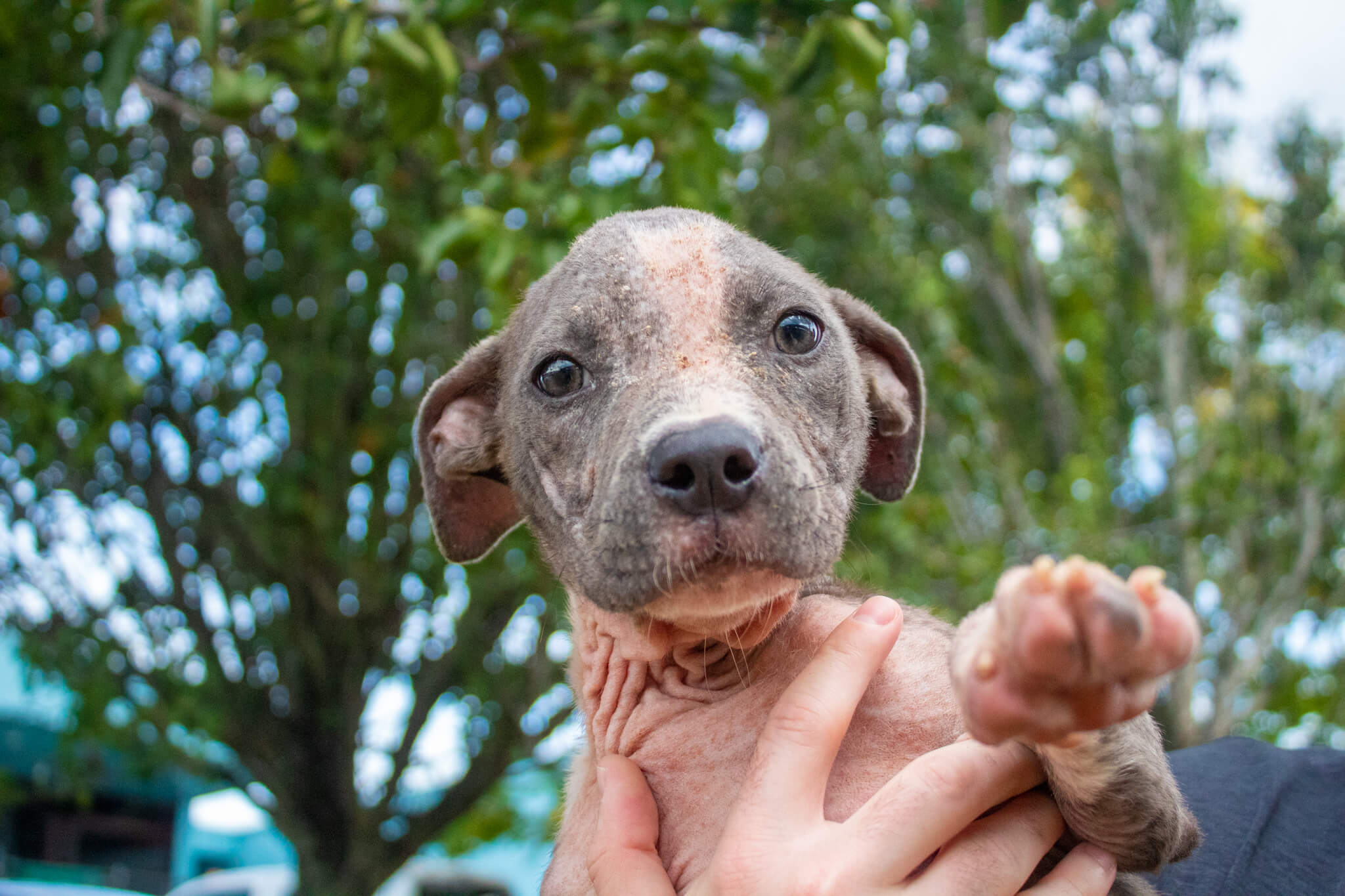The animal cruelty officer wasted no time and brought the puppy to the shelter for the urgent veterinarian care she needed. The shelter assessed her skin condition and diagnosed her with a serious case of demodex mange. The condition is commonly caused by a parasite that burrows under the hair follicles of dogs and develops when a dog has an immature immune system – where the number of skin mites multiply quickly.