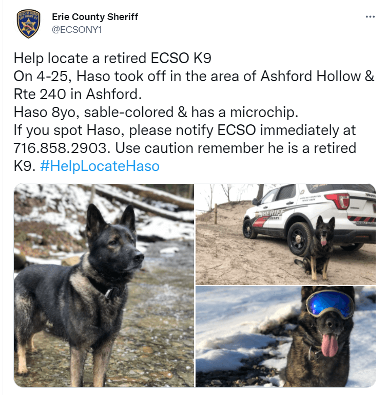If you spot Haso, please notify ECSO immediately at 716.858.2903. Use caution remember he is a retired K9.