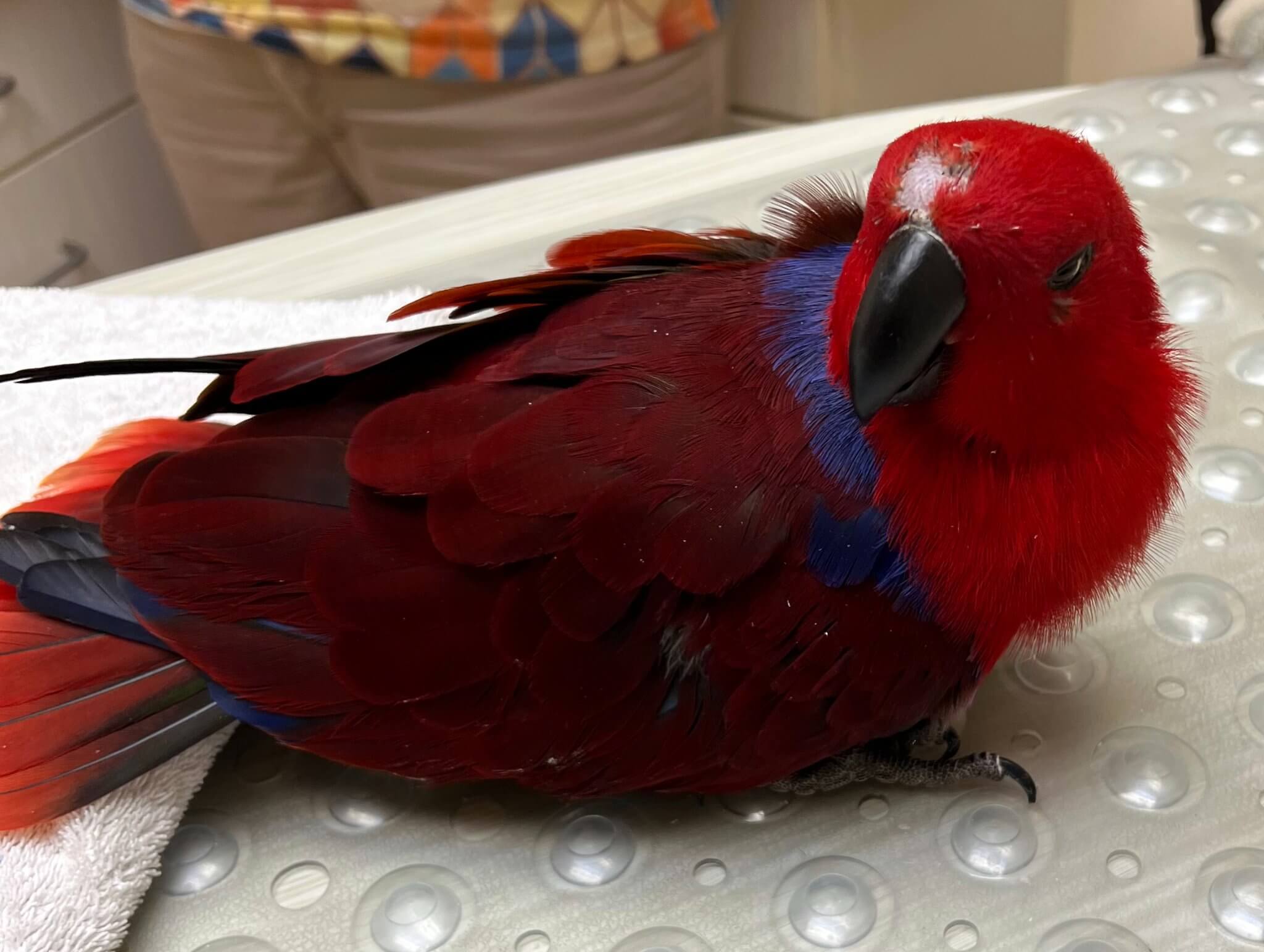 Piper is VERY lucky to be alive. He had horrible injuries but also was “out in the open”. Hawks will often swoop down on brightly colored parrots as “free food”. This is why one should not walk around outside with their parrot on their shoulder. People have actually had claw marks and injuries on their shoulders from the hawk snatching their parrot……..