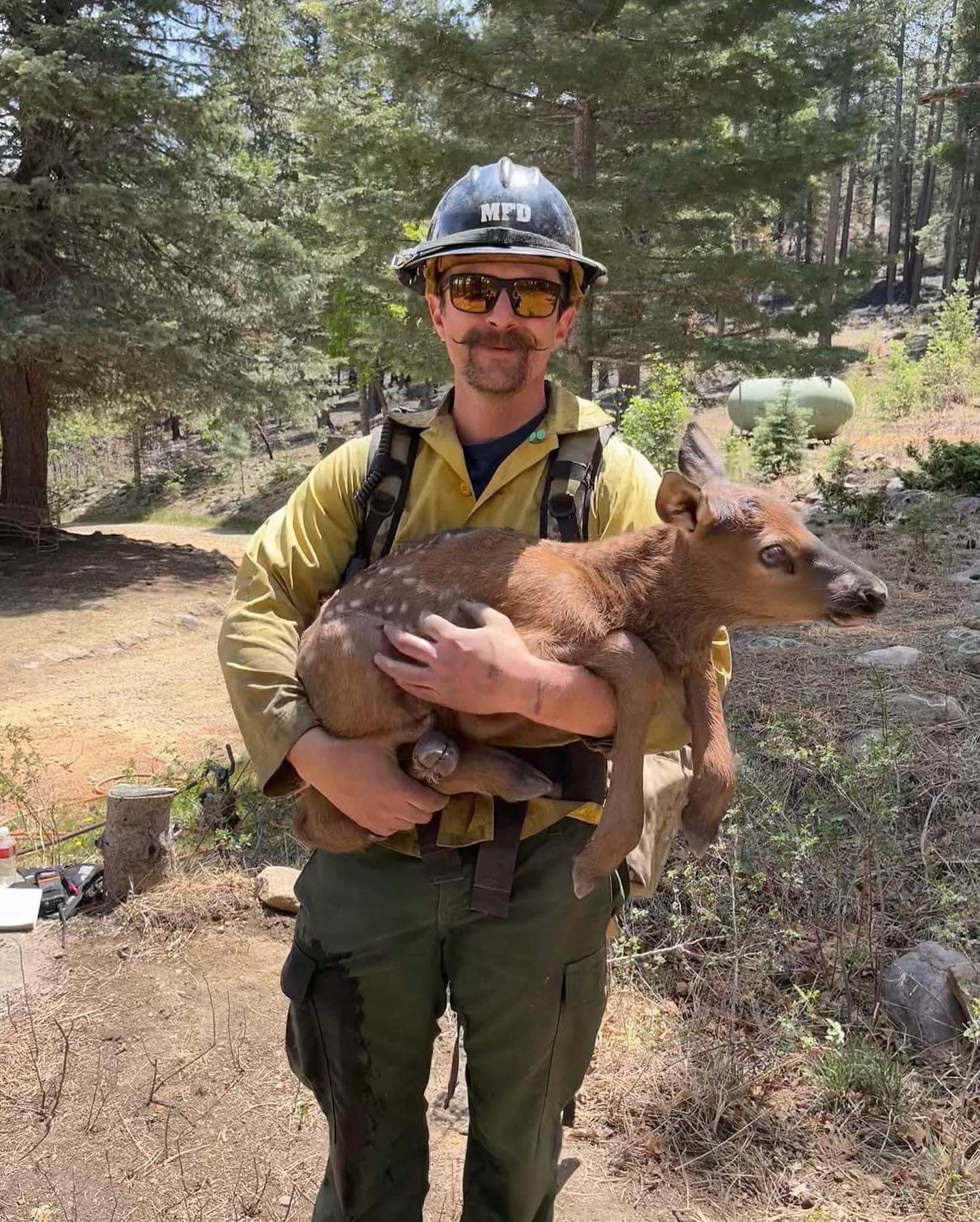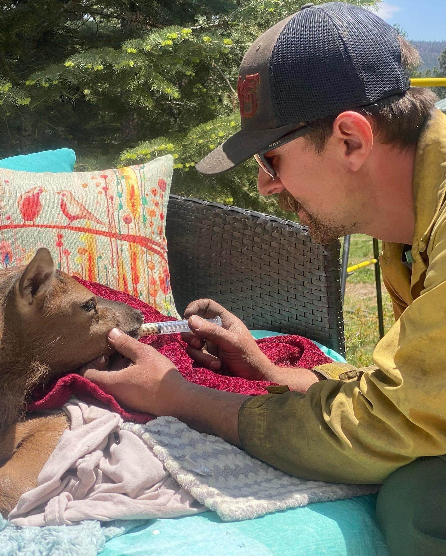 A newborn elk calf affectionately named “Cinder” was discovered in a remote, fire-ash area of the Sangria de Cristo Mountains near Santa Fe, New Mexico last weekend by Missoula firefighter, Nate Sink. The calf had been abandoned by its mother after the fires raged across 486 miles of dried forests. Nate had been on patrol and had been extinguishing hot spots when he found the defenseless calf.