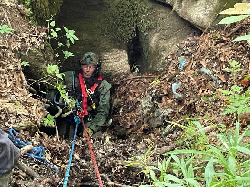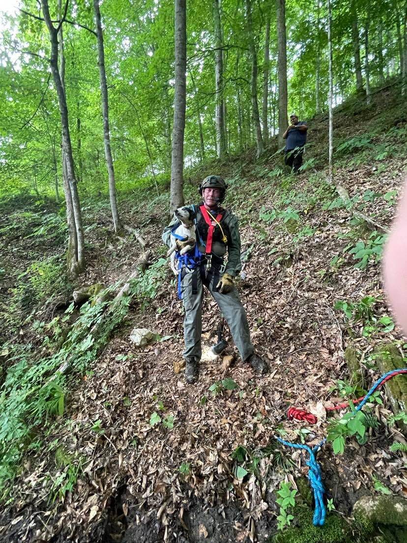 Team members arrived, and with the help of the Goshen Valley Volunteer Fire Department, a team member was lowered into the approximate 30-foot vertical sinkhole and made contact with “Killer” who was very excited to see him. Team members successfully brought the rescuer and Killer out of the sinkhole to safe ground. Killer was reunited with his owners unharmed.