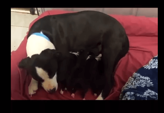 The mother dog was devastated and spent the next day in a panic searching for her babies. Nothing seemed to be able to comfort her; that is until Pits & Giggles called out to other rescues and shelters for help. Miraculously four pit bull puppies, just a few days old in need of a mother, were located.