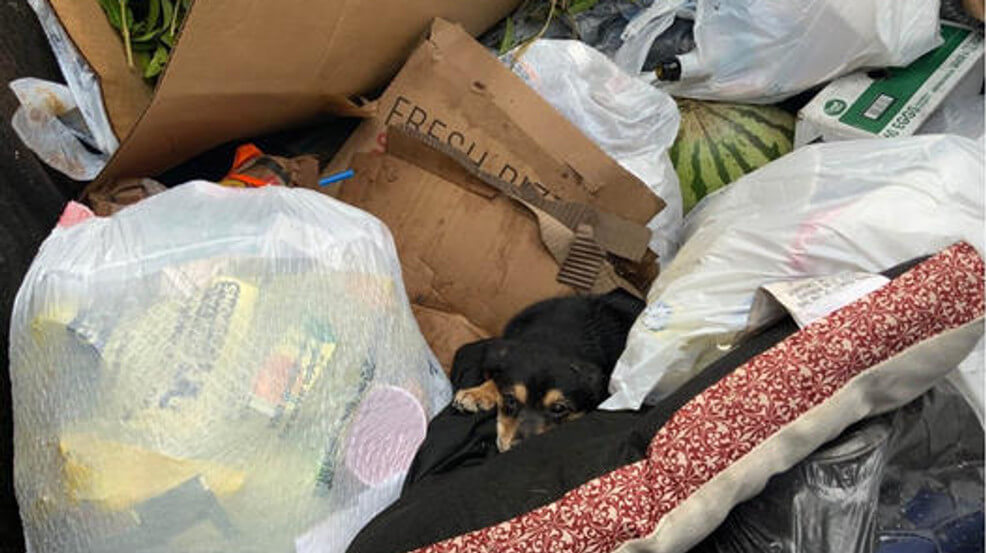 According to AbcNews, the German shepherd and hound mix is only six to eight weeks of age and was discovered lying inside of the commercial dumpster near his bed and surrounding trash.
