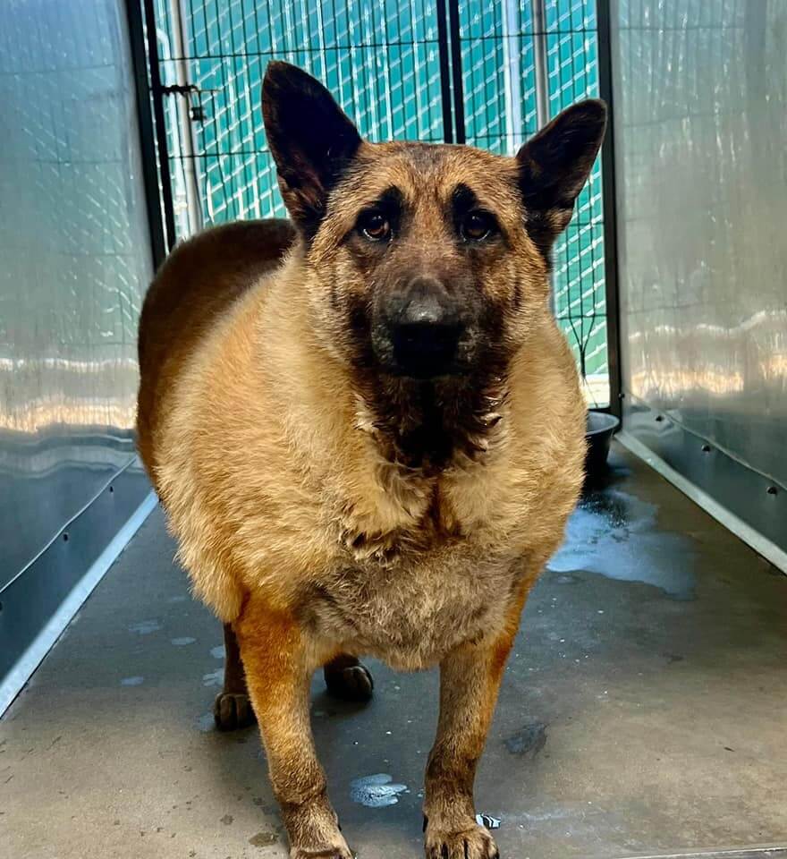 A shockingly obese German shepherd was taken in at a busy California animal shelter this week. The two-year-old dog weighs in at 125 pounds and he should weigh a mere 50 pounds. His weight is so high that it is believed that he is suffering from a thyroid disorder.