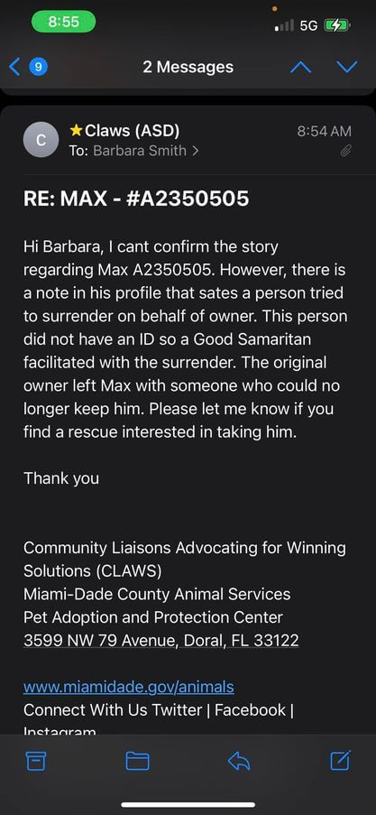 Please see below – adoptions are made in person at at the shelter Miami Dade Animal Services3599 NW 79th Avenue, Doral, Florida 33166Call (305) 884-1101 or email [email protected]