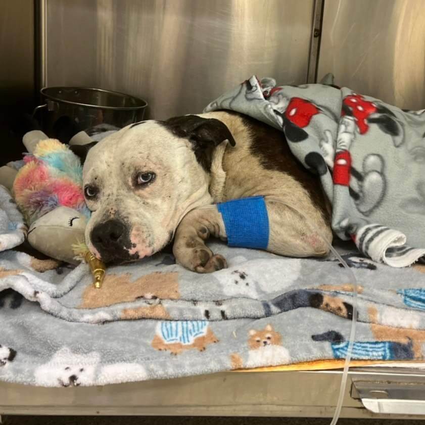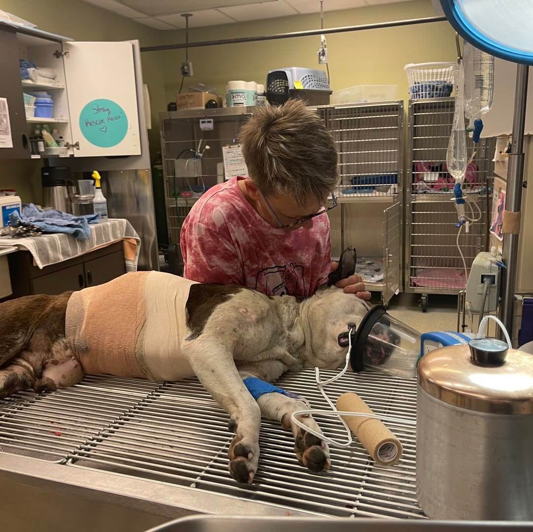 Adira was rushed to the partner rescue veterinarian for Stray Rescue of St. Louis, She was sedated her injuries were cleaned and assessed. It appears it had been an abscess from a large wound. Dr. Schulz cut away as much dead muscle and tissue as she could; through three layers of muscle, all the way to her ribs and almost to her spine.