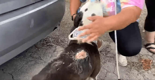 A terribly neglected dog with egregious open and infected wounds located on the side of her body and her shoulder, didn’t stop the dog from slowly approaching a rescuer on a city street in St. Louis on Friday afternoon. Within minutes, her eyes, the color of the bluest sky, melted beside the human who would help to save her life. Her tail wagged; she knew she was about to be rescued.