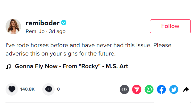 Remi Bader, a TikTok star and curve model, recently blasted a ranch in Montauk, New York, for denying her a horse ride because of her weight. Three days ago she posted a video to TikTok, saying “Shoutout to Deep Hollow Ranch in Montauk for making me leave because I weigh over 240.” She also said that she has never had problems riding horses in the past.