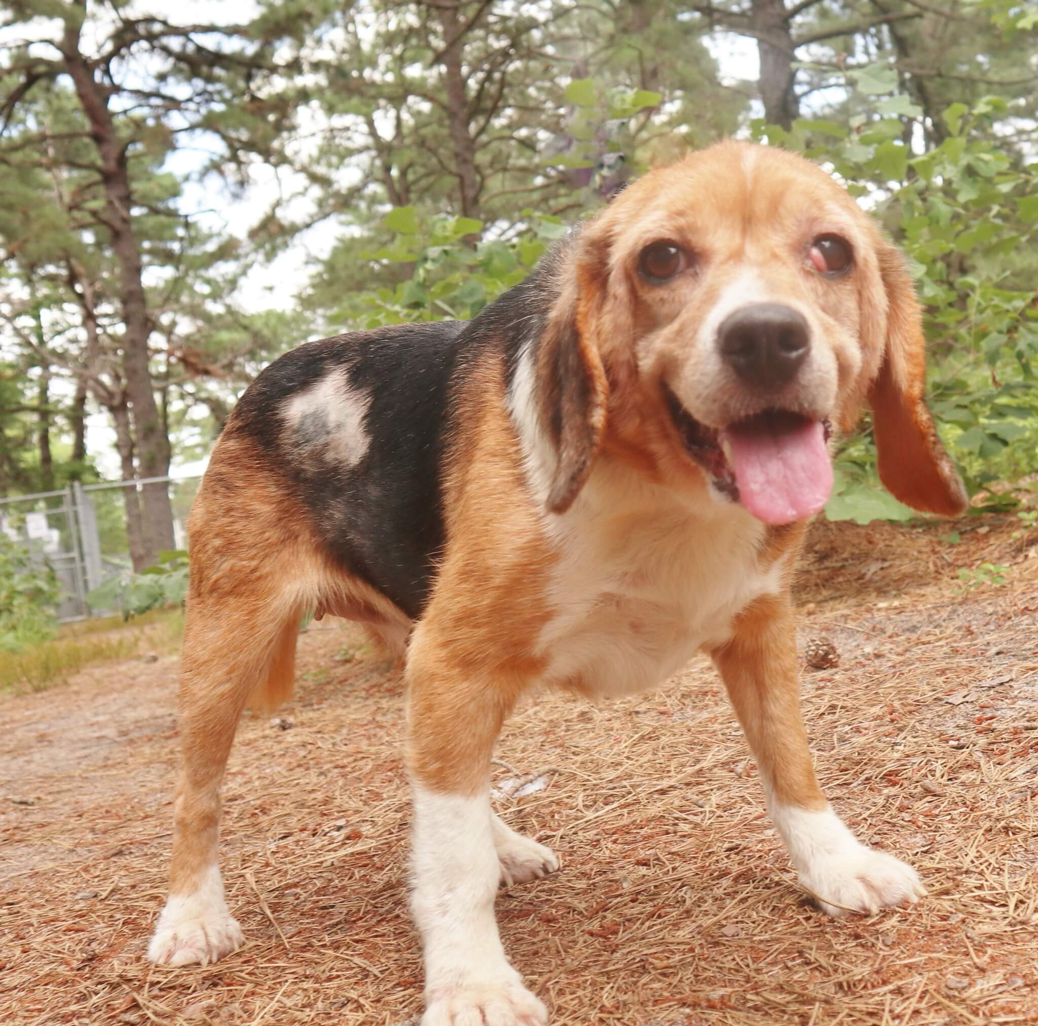 On July 6, a motorist spotted the senior male beagle wandering in the woods near the parkway ramp. The police were notified, and an Animal Control Officer had been in the process of picking up the dog at police headquarters when another abandoned beagle was found in the same location and taken to the county shelter. The officer brought both beagles to the AHA/Popcorn Park.