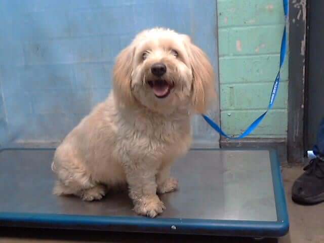 Before his was assessed, he was given some time to decompress. He came over and sniffed the handler’s legs and hand even though he was nervous. Once t he handler was ready, she called out to Peppy and he walked over. He allowed his ears, teeth, stomach, rear, feet and tail to be handled, and at the end of the assessment, he walked away, but came back.