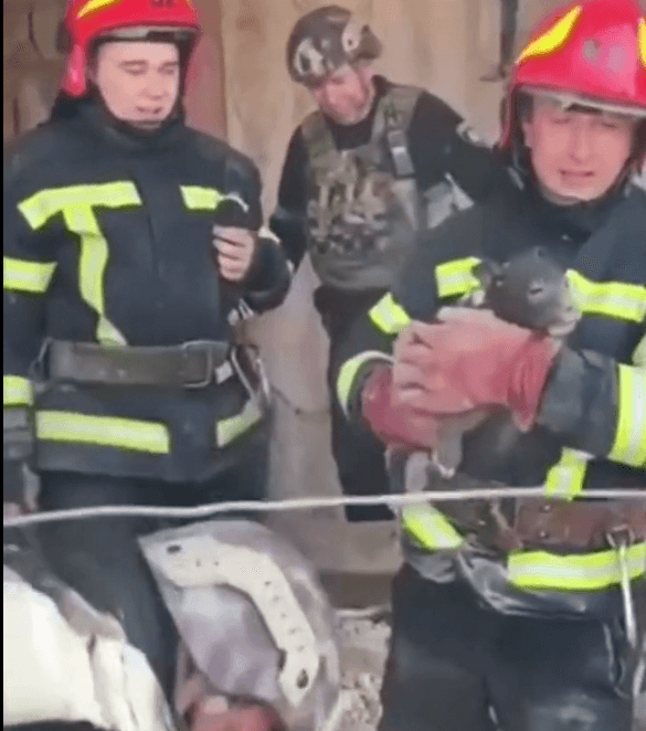 The video, posted on Twitter by Anton Gerashchenko, shows the rescuers desperately digging amidst the debris and finding the frightened puppy covered in sand and soot.