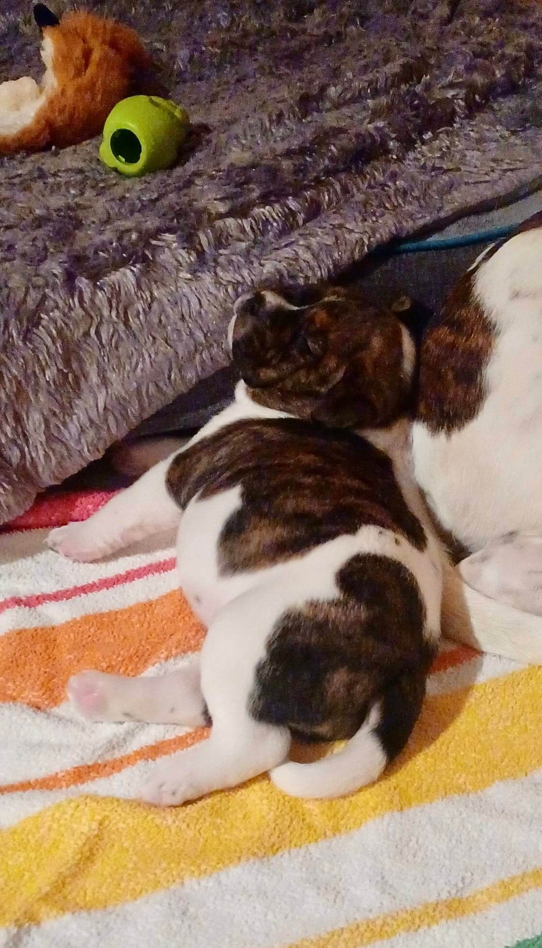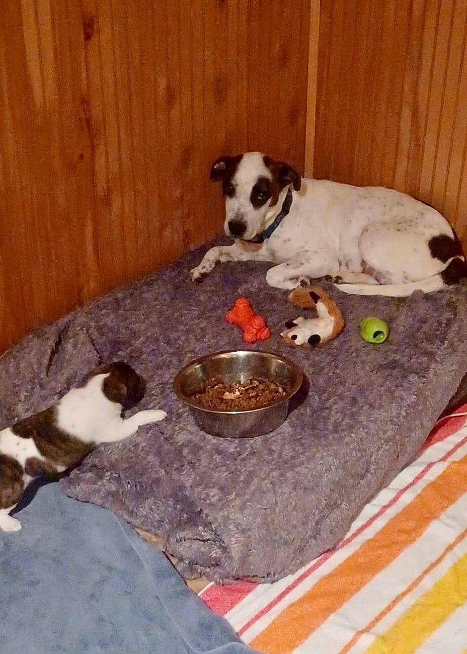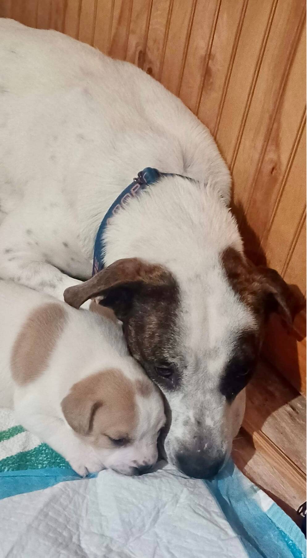 Ziva is a wonderful momma dog and watches over her babies very carefully, tending to their every need. She is also doing fantastic and is very accepting of affection. She is still shy and quiet, but loves the quiet company of soft pets while she rests.