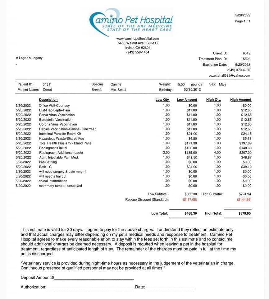 Donations can be made directly to my vet: M-F 7 am – 6 pm Camino Pet Hospital949-559-1404 Under Logan’s Legacy29