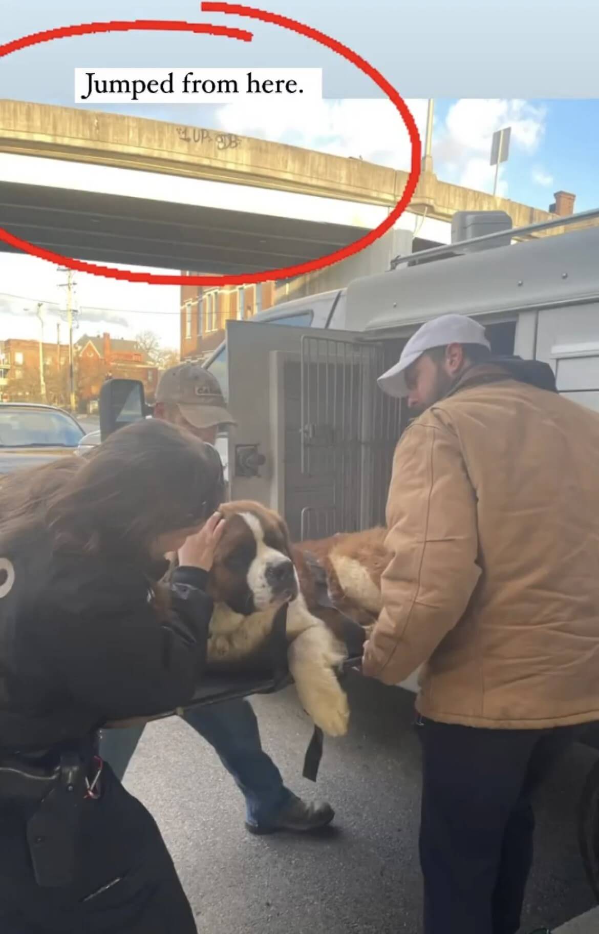 A scared, homeless dog shocked everyone last week when he leapt over the side of the interstate and fell off the 20-foot overpass before hitting the sidewalk below. Miraculously, the dog survived the fall.