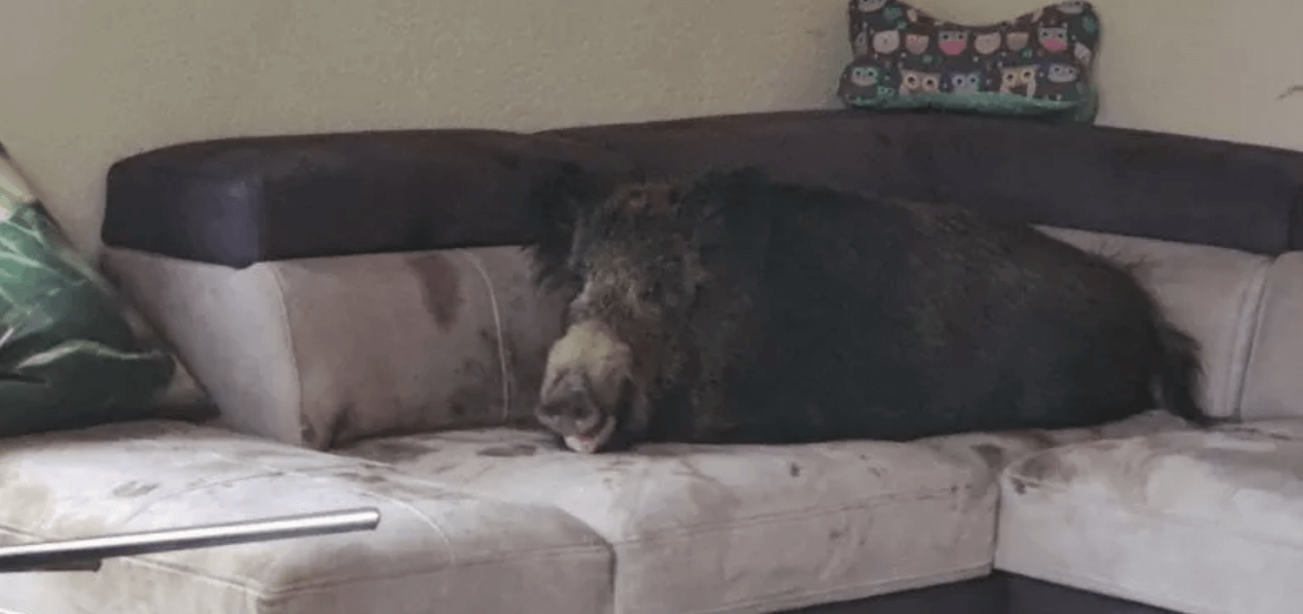 The wild boar had wrecked the furniture and had made itself comfortable on the living room sofa. It probably entered the ground floor through a patio door. When the door shut, it got trapped.