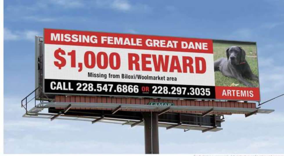 A woman in Biloxi, Mississippi, is desperate to find her missing Great Dane, Artemis, who has been gone for nearly a month. The dog’s owner, Charmayne Merrill, has put up hundreds of fliers in the area, and she even got a billboard to help raise awareness about her lost companion.