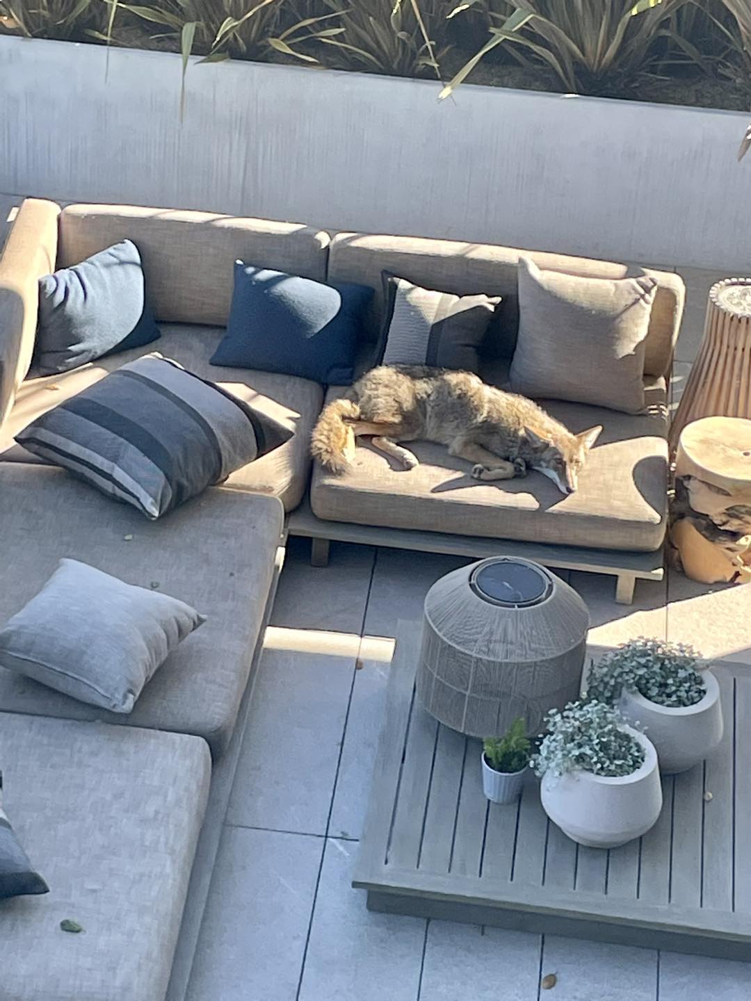 The concerned resident was afraid the animal was sick or injured and called for an animal control agent to come out to their home to assess the situation. Officer Mullen arrived and went into the backyard where the coyote was comfortably curled up on the couch.