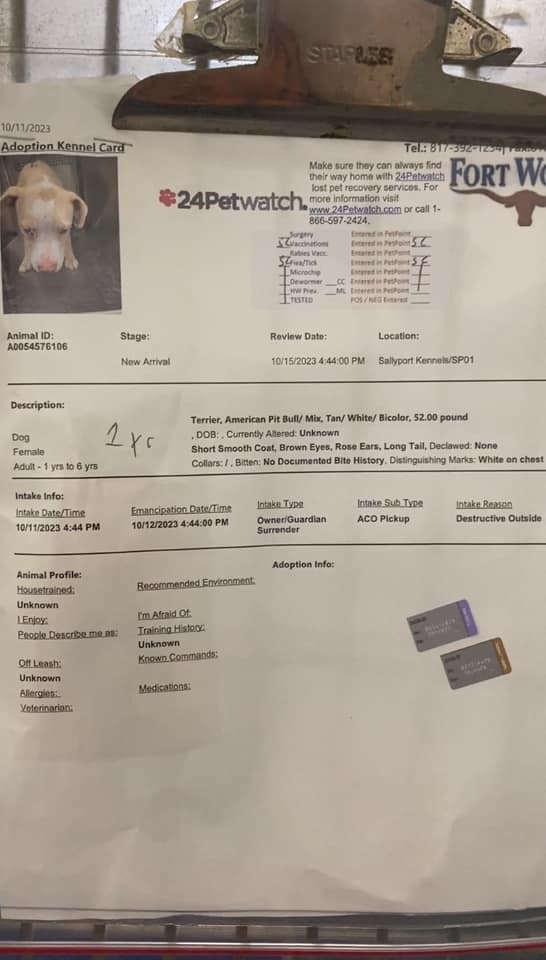 This animal is located at Fort Worth Animal Care and Control/Chuck Silcox Adoption Center, 4900 Martin Street, Fort Worth 76119.