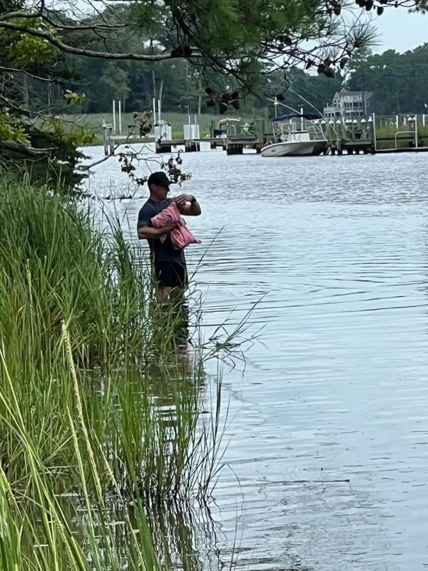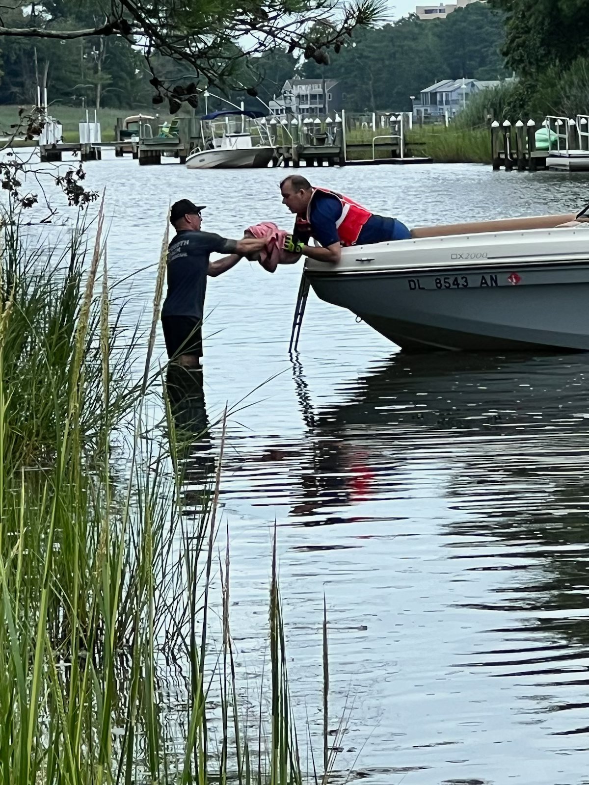 It had been Ryan Peters, assistant chief for the fire department who volunteered to work his way to the dog, meeting one of the boat’s occupants after wading through thigh-deep water and hiking through 300 yards of marshlands. The small, scared tan dog had been perched on a knot in the tree, He had been able to climb up but was not able to get down.
