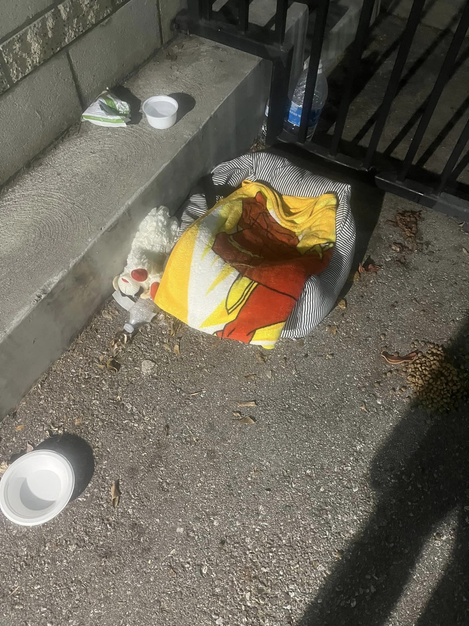 i wish you could have seen the area she was surviving in. Thankfully the employees brought her food and that little bed; her little safe spot. you are rescued!