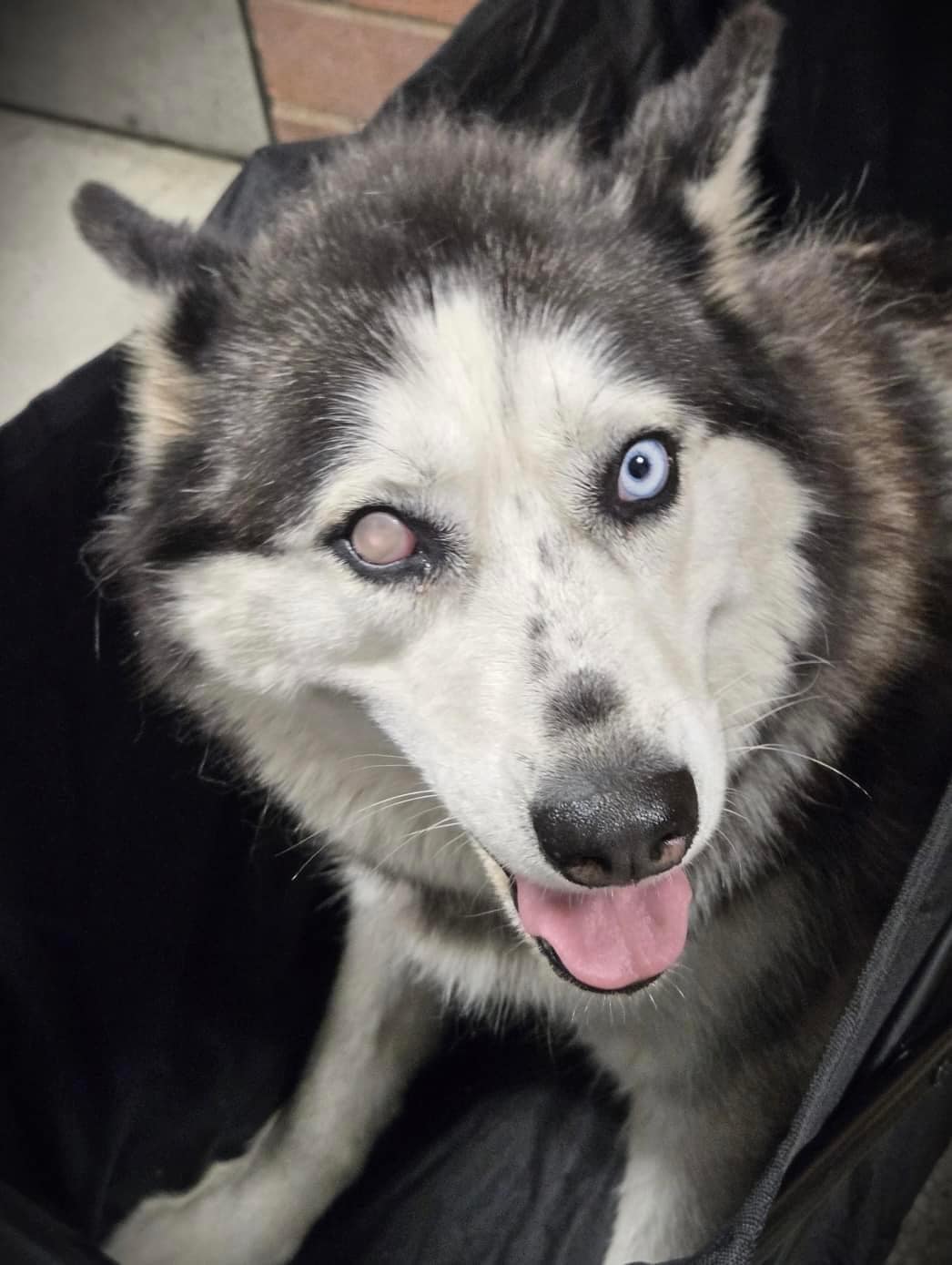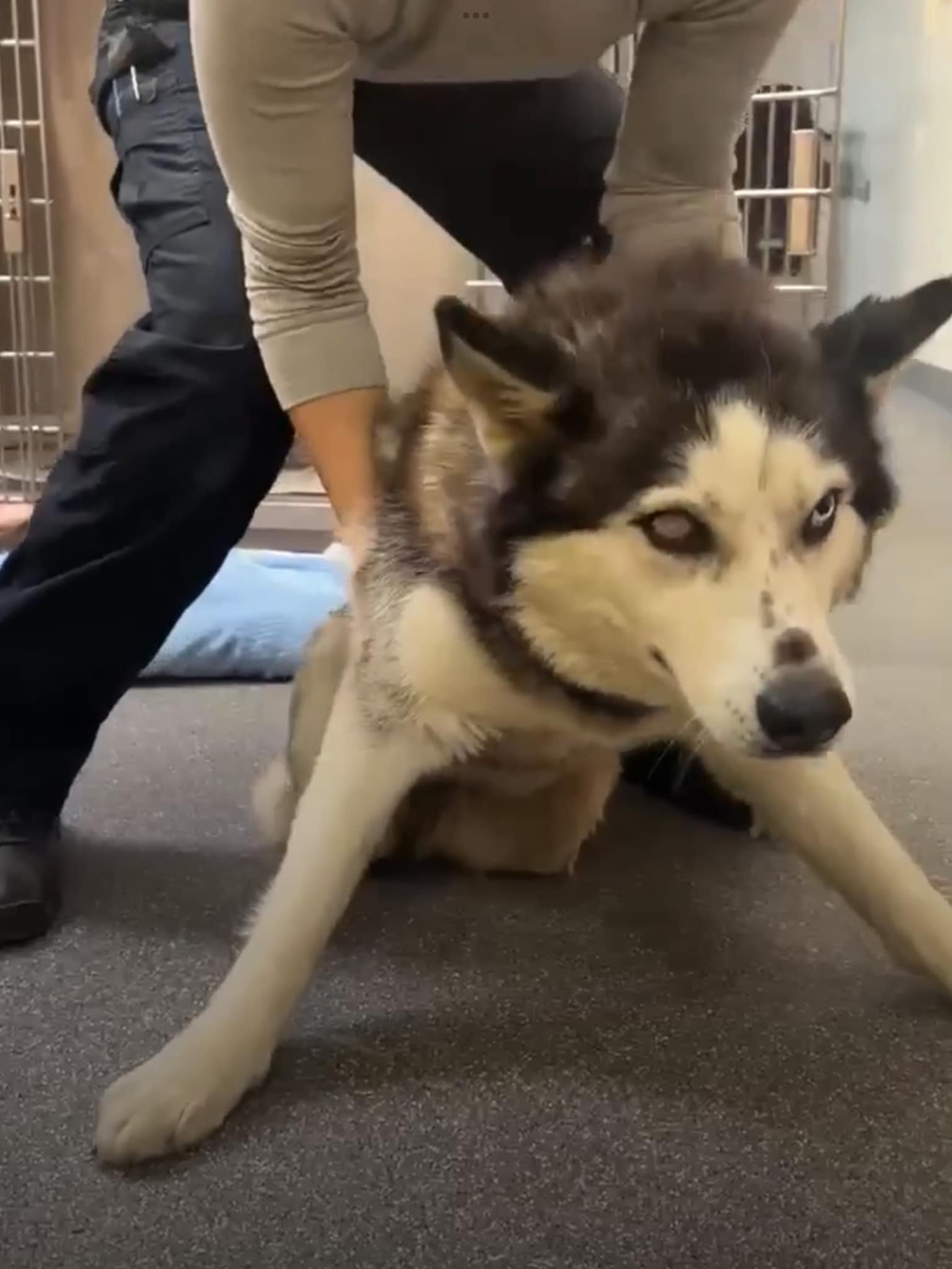 Hope has no back legs and is blind in one eye. She also arrived with male husky Keniy.