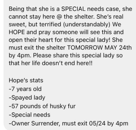 Please reach out to approved rescue organizations, friends, family and social media contacts to share Hope’s plight. Sharing saves lives.