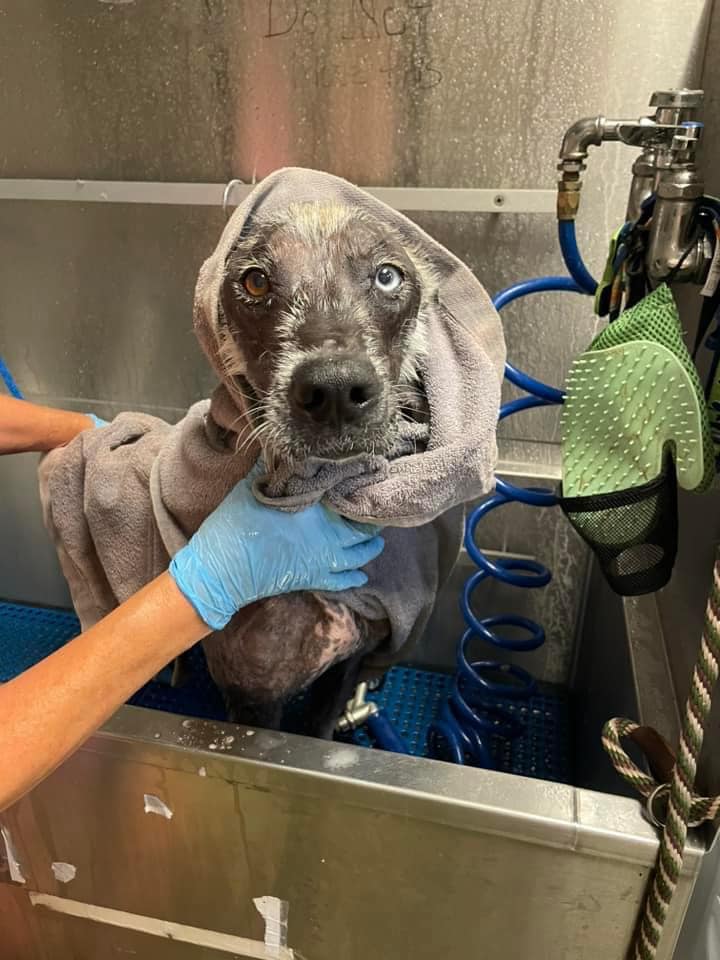 During his first medicated bath, he “wailed out in pain” as the mites had caused terrible open sores that must have felt as if they were burns. He shook in fright, but soon began to feel a little bit better and enjoyed the feeling of a soft towel gently patting him dry.
