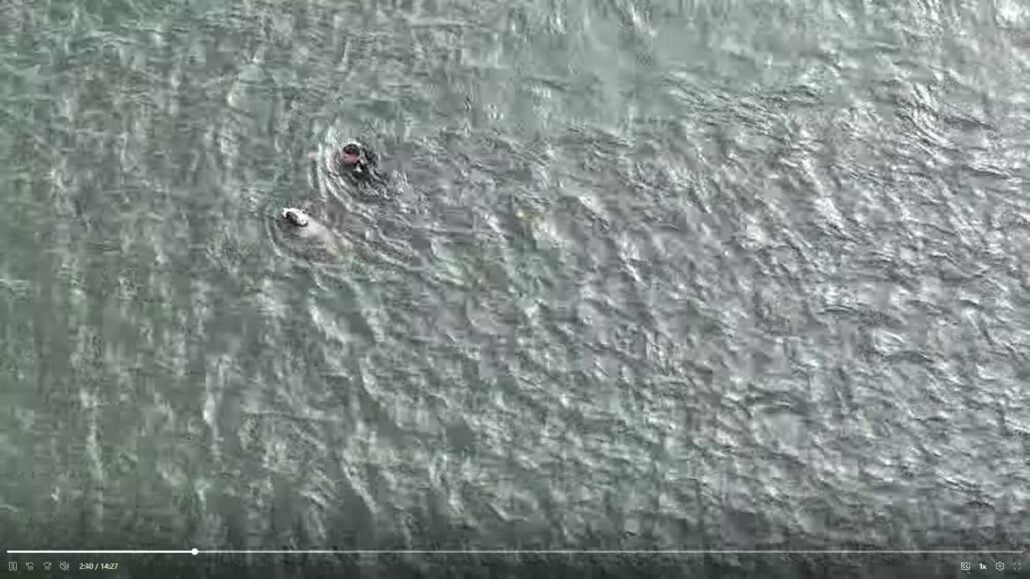 Officer Schmidt removed his shoes, his uniform and his weapon and jumped into the water – swimming 100 yards against the strong current to reach the dog and safely bring him back to the shore. The officer used a spare bite pole to guide the dog back to land.