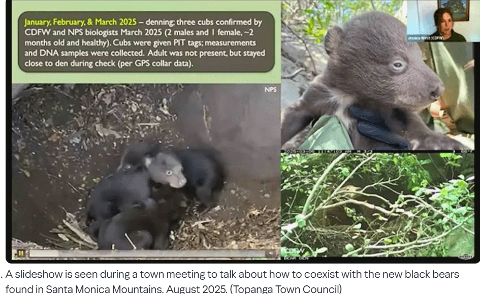 Just recently, Yellow 2291, estimated to be between five and seven years of age, brought with her three cubs, and they are recorded to be the first black bear family to make themselves at home in the Santa Monica Mountains in years.