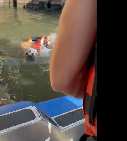 The Marine Unit were then able to contact Brandon who boarded the boat to locate Faroe. After the dog was spotted, a Marine Unit diver went into the water to retrieve the dog. Although Faroe did seem hesitant and frightened, after hearing her owner calling her and hearing one of her favorite squeaky toys, she soon cooperated and boarded the boat.