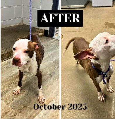It had been in March 2024 when Raisin arrived severely underweight with terrible skin issues, a mere shell of a dog and earning her the name ‘Raisin’. She weighed a mere 17 pounds, nearly half of what she should have weighed. She arrived starving, terrified and covered in sores, open wounds and scars.
