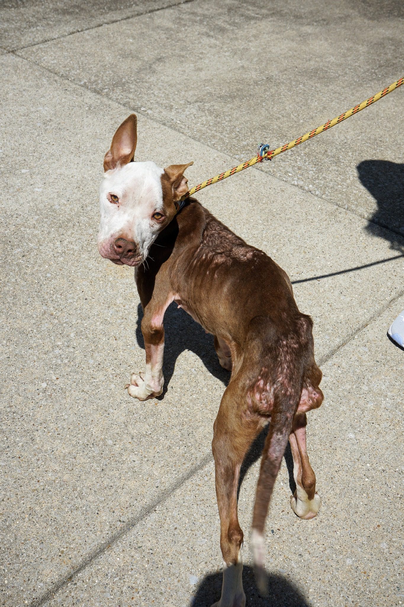 Every bone of her body was visible; her stomach was sunken and the lack of puppy fat on her pitiful face all bore witness to the unimaginable neglect and abuse she must have endured.