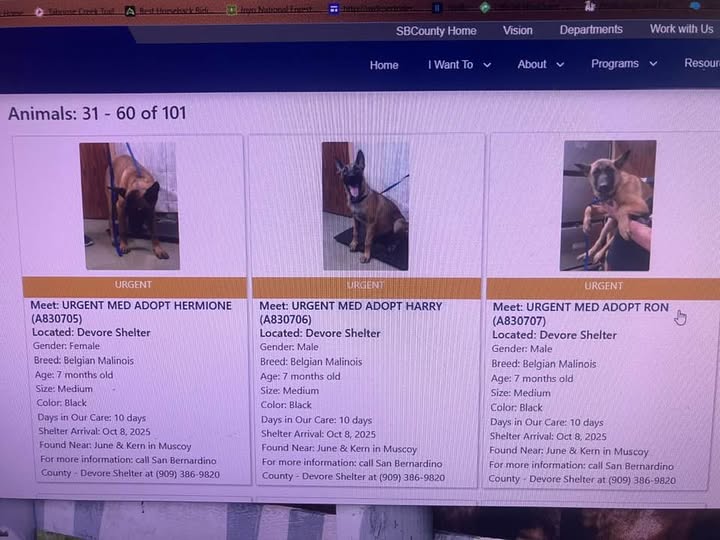 Harry (A830706) and Ron (A830707) are seven-month-old male Belgian Malinois puppies. They also came in with their sister Hermione (A830705). The active and friendly puppies arrived at the Devore Animal Shelter, located in San Bernardino, California on October 8, 2025.