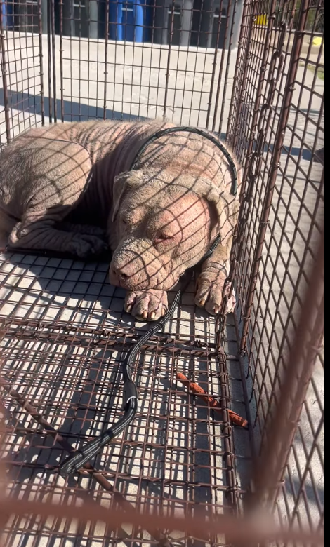 Bright pink from her mange, so tired