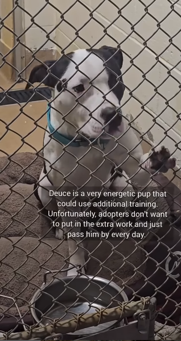 Deuce looks forward to the shelter opening in the morning, as would be adopters check out the pets needing homes. The moment Deuce spots someone approaching his kennel, he pushes upward with his paw as if waving, wags his tail and smiles from floppy ear to floppy ear.