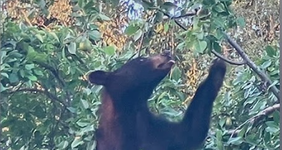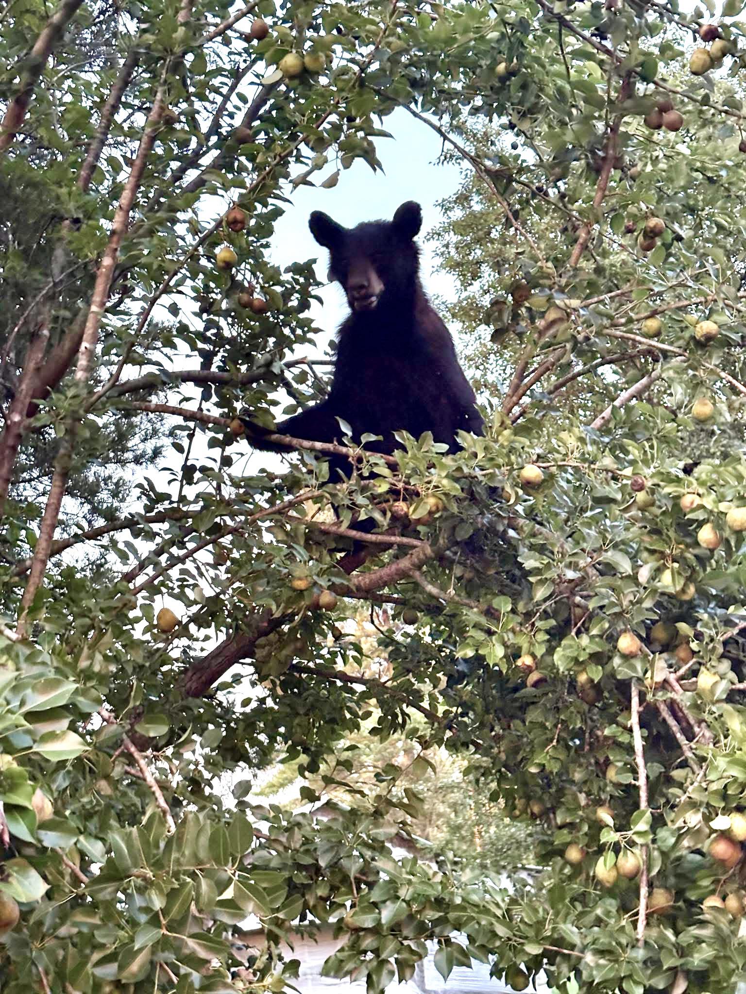 A black bear showed up at a home in Tuscumbia, Alabama about a week ago and made himself at home. First he started nibbling on the tomatoes, and then he lumbered over to the pear tree and climbed up with the intention of knocking the pears off the branches onto the ground.