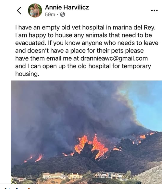 If anyone affected by the Palisades fire needs help with their animals please let me know …[email protected] I have an old veterinary hospital in Marina del Rey we can use to house animals. Please spread the word and let me know if anyone needs help.