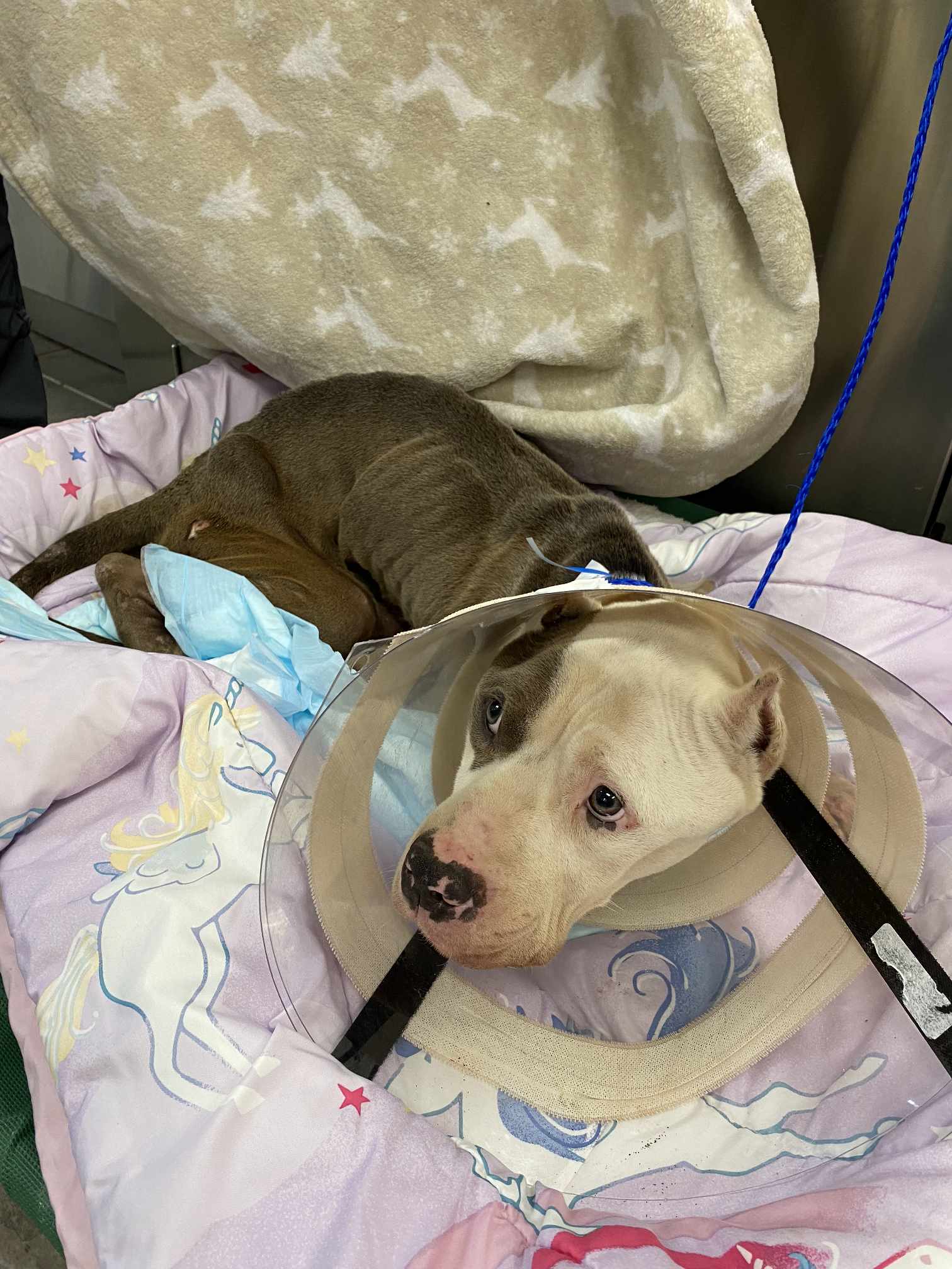Diagnostics including X-rays, showed he did not have any glaring trauma to his spine. He currently does not have any deep pain sensation in his hind end and legs. He does however have a strong will to live. With the assistance of a sling, he was able to walk a bit last night at the ER. He does not necessarily know where his hind legs are. His blood work is indicative of his emaciation. He is eating well and receiving small frequent meals as his customary protocol for starved dogs. He is anemic due to fleas and intestinal parasites as well.