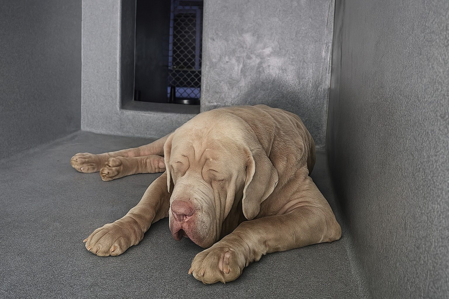 And here we first meet Bruiser in his kennel at the Carson Animal Care Center in Gardena, California; all curled up – his rather painful eyes tightly shut as if waiting to forget the world or perhaps hoping the world will soon forget him.