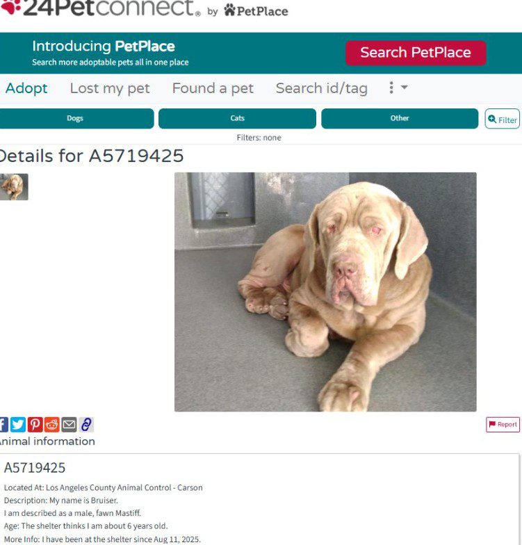 #A5719425 My name is BRUISER and I’m an approximately Unknown old male Mastiff. I am not yet neutered. I have been at the Carson Animal Care Center since 8/11. I will be available on 8/11. You can visit me at my temporary home at C123.