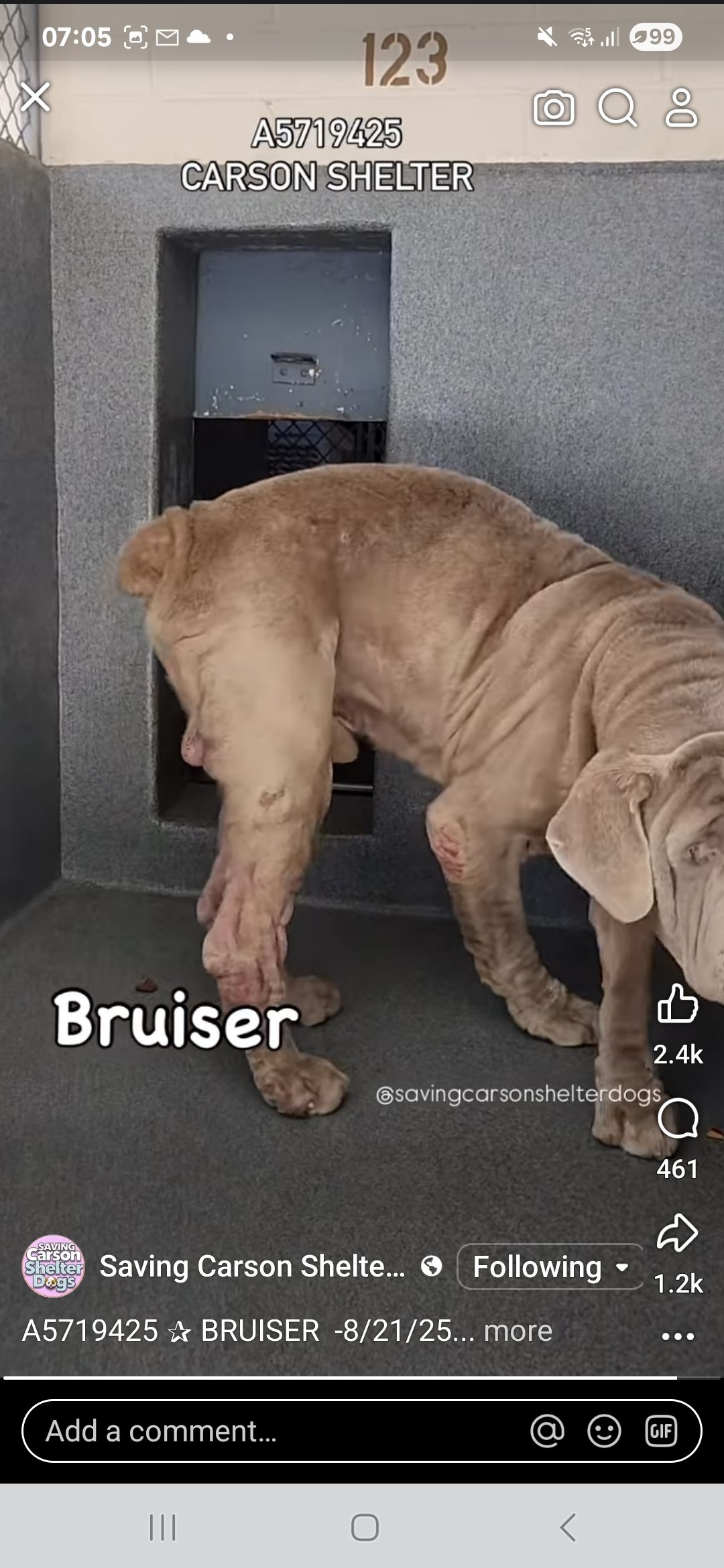 Please share Bruiser’s plight with approved rescue organizations, friends, family and social media contacts. Sharing saves lives.