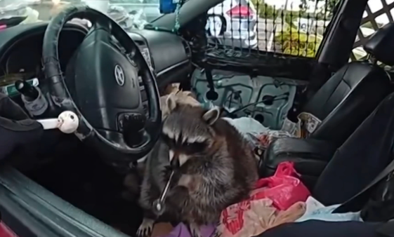 as Officer branham returned to the vehicle, he observed a raccoon named ‘Chewy’ sitting in the driver’s seat with a meth pipe in its mouth. Chewy had somehow gotten hold dof a glass methhamphetamine pipe, leading officers to further inspect the vehicle.
