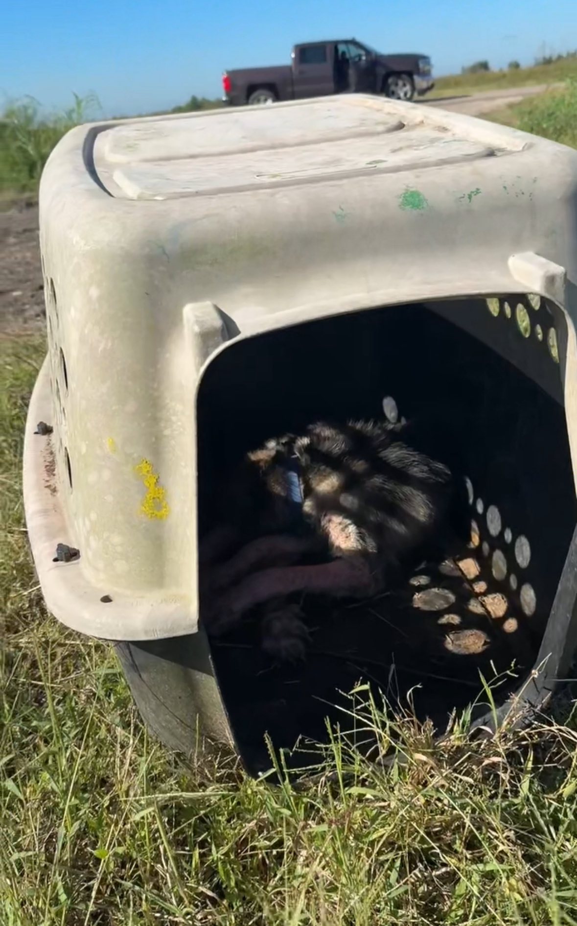 Just three days ago, Aspen was found abandoned with a kennel on a Houston, Texas rural farm dirt road. He had been left for days with no food, no water and no shade from the hot sun; there was no way he could escape.