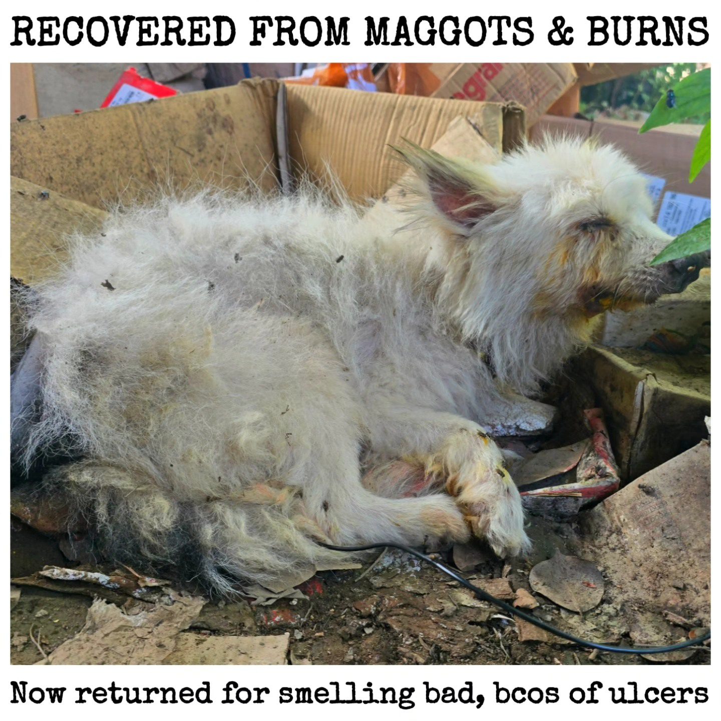 With maggots eating insides of his mouth, scared with one arm broken, he ran with all his might and his inside an empty factory for five days. Infection runs deep in his skin – his kidneys are affected and he refuses to eat…