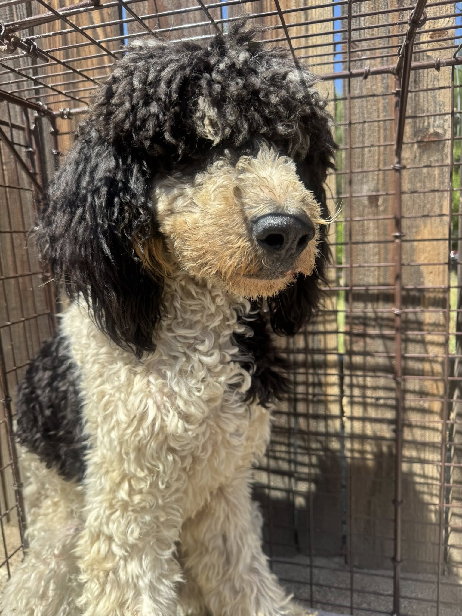 If you’re unfamiliar with the Parti Poodle, these beautiful dogs are purebred poodles with a white base and irregular patches of another color; in this case black. The name “parti” refers to the dog’s part white and part black coat coloring.