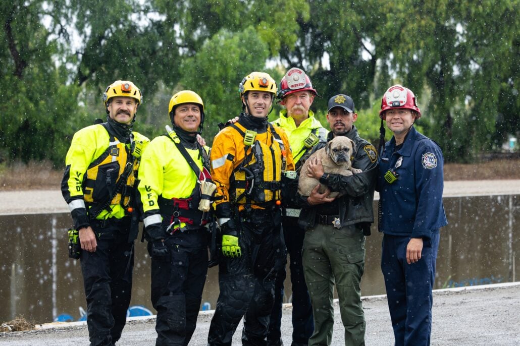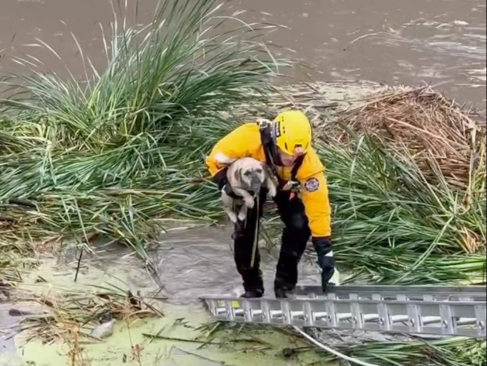 In Oxnard, California, a firefighter from the Ventura County Fire Department braved rising floodwaters on Tuesday to rescue a stranded pup curled up in the weeds during a torrential rain storm in Southern California.